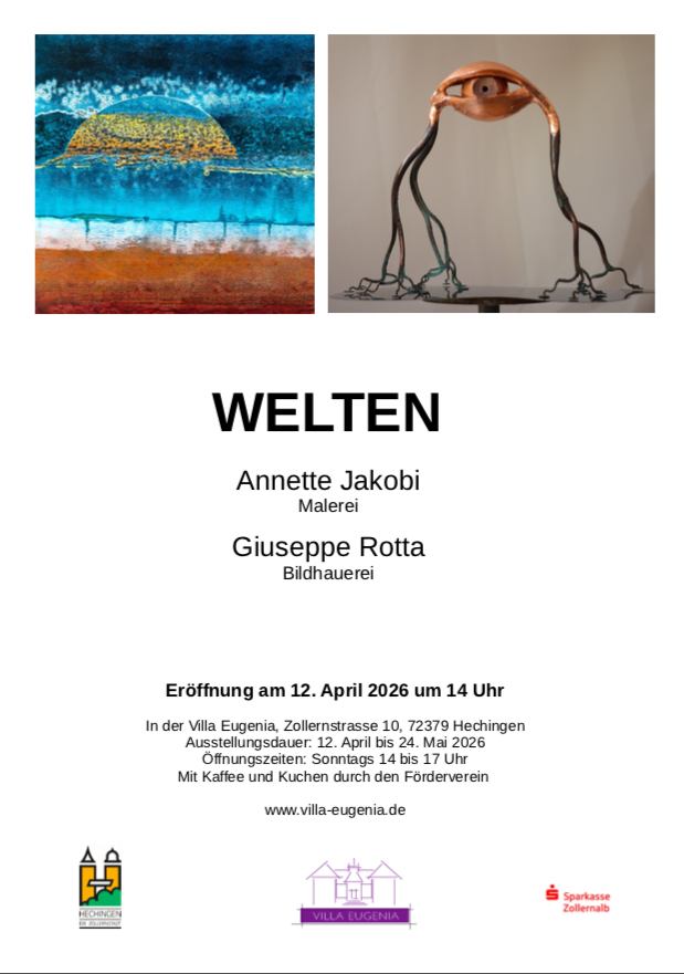 In der Villa Eugenia, Zollernstrasse 10, 72379 Hechingen Ausstellungsdauer: 12. April bis 24. Mai 2026 Öffnungszeiten: Sonntags 14 bis 17 Uhr