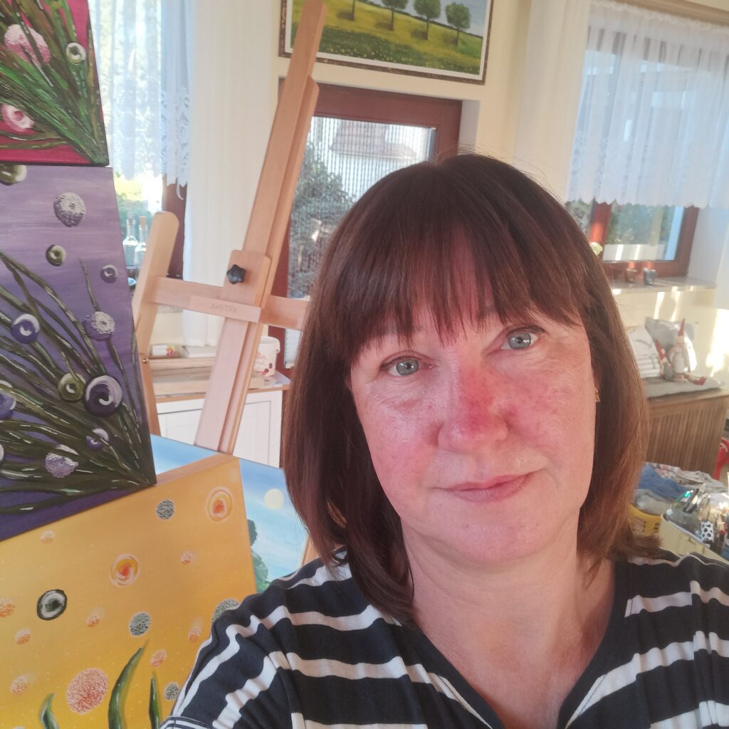 Sie malt aus dem Herzen, folgt frei Ihrer Intuition. So entstehen farbenfrohe, kraftvolle und ausdrucksstarke Werke, ohne Vorzeichnung oder Probe.